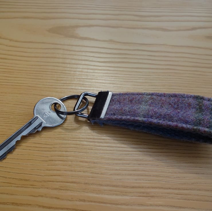 Handcrafted key fob which has been made with check pattern tweed and inner lining is made with grey cotton webbing.