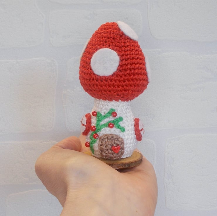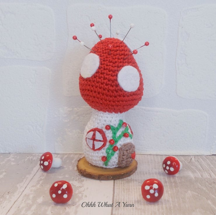 It sits on a thin varnished wood slice. It will come complete with pins but if you are not a sewer it makes a perfect ornament for all toadstool and mushroom fans.