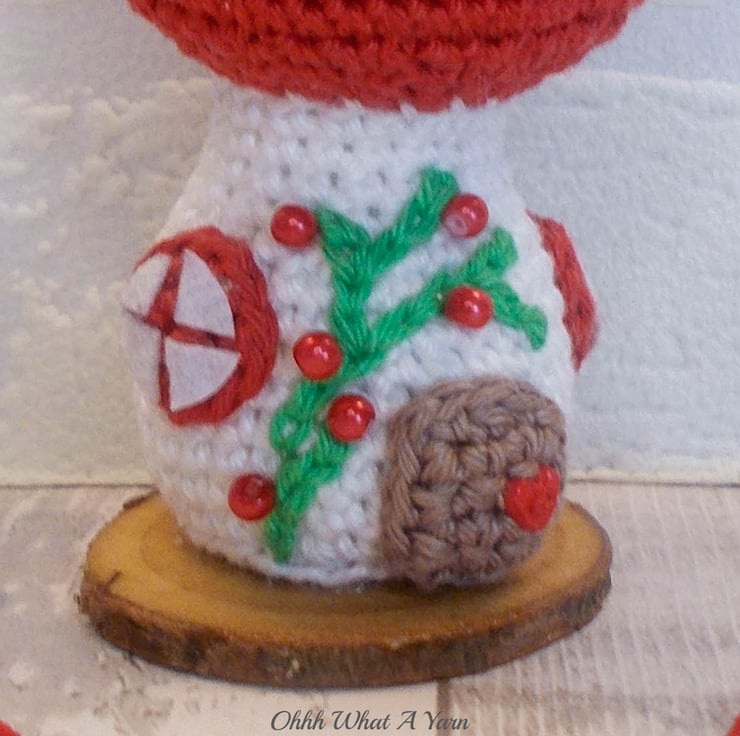 It has two little round windows and little door with a tiny button handle. Around the door I have embroidered vines and hand sewn little beads and felt spots.