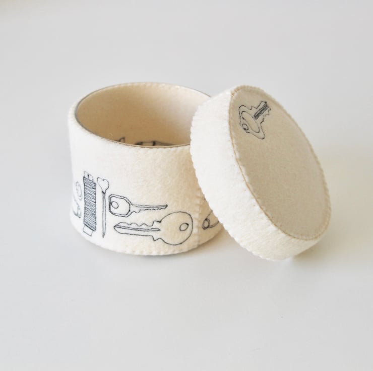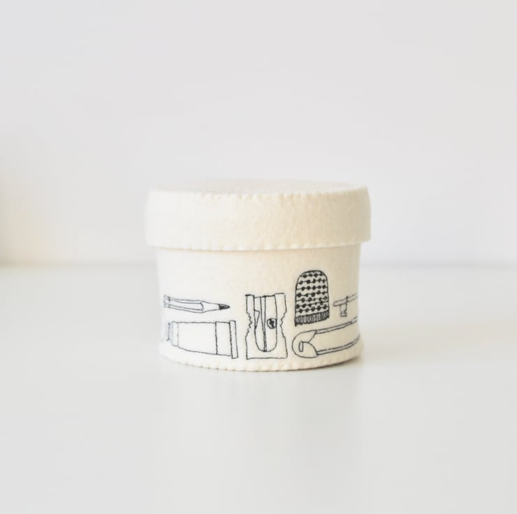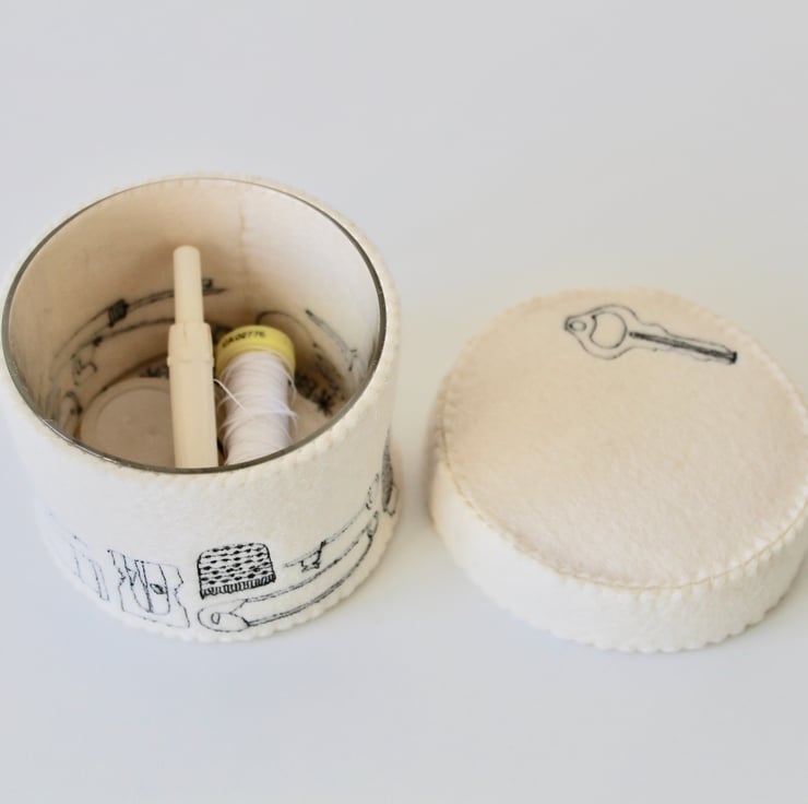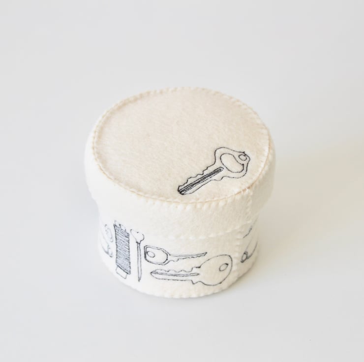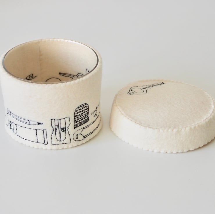 A unique 100% wool felt storage pot with lid, adorned using free hand machine embroidery, with a thimble, safety pin, key, button, pin, cotton reel, pencil sharpener and quick unpick. With a key on the lid.