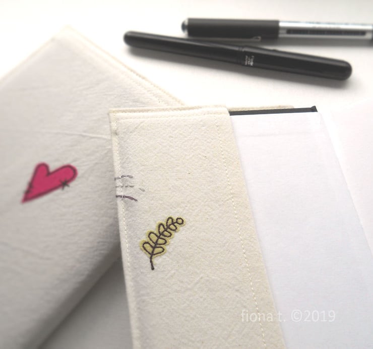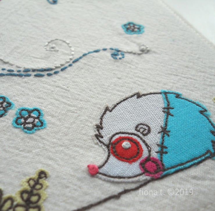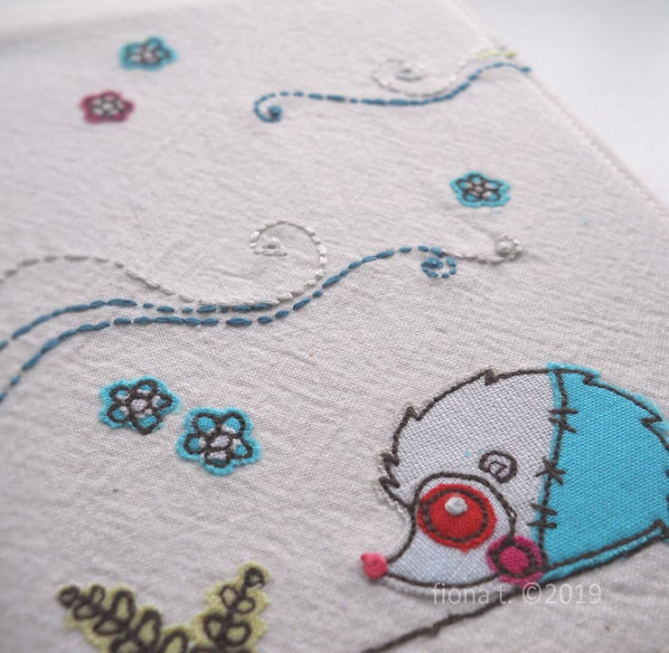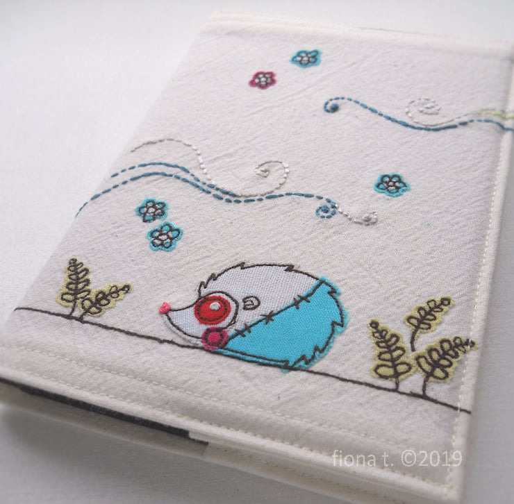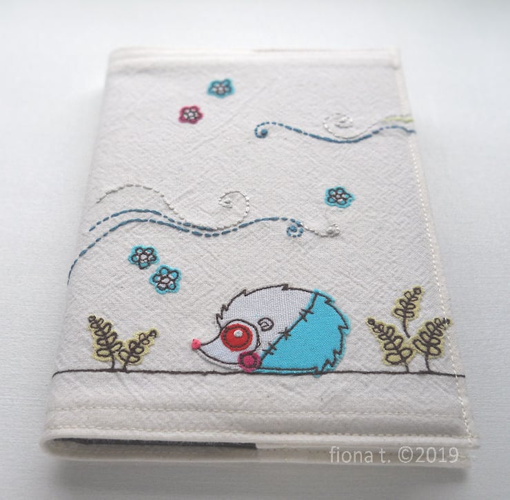 freehand machine and hand embroidered zombie hedgehog fabric notebook cover with A6 sketchbook inside.