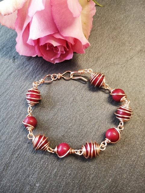 Handmade and wire wrapped bracelet using .8mm rose gold plated wire combined with red/pink toned quartzite gemstone beads. Each link is made separately and by hand by using wire looping, bending and forming techniques. The clasp has also been hand made to ensure that the clasp matches beautifully with the rest of the bracelet.