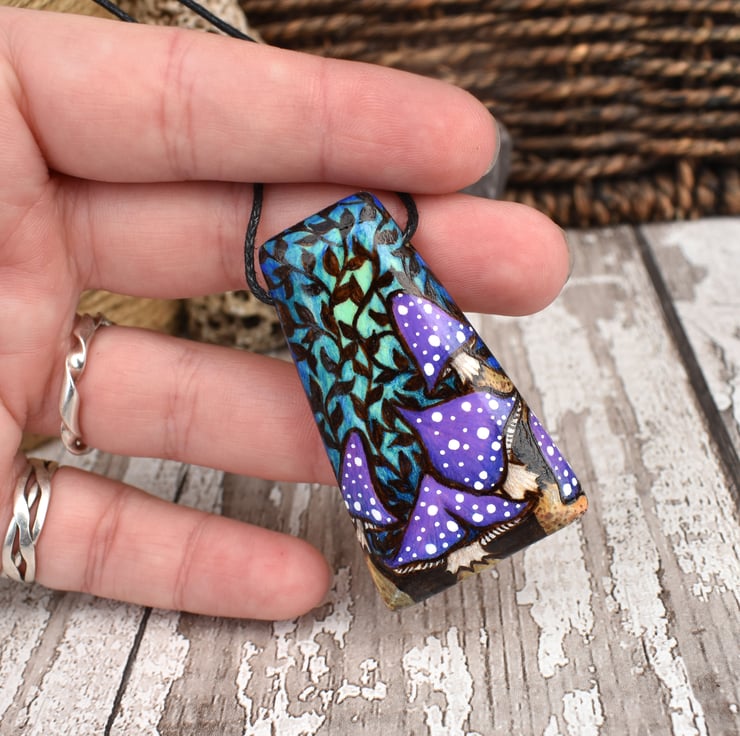 A group of purple shroom are growing in a shady woodland on this pendant. It has been decorated by hand using pyrography, and coloured using intense prismacolor pencils in purples, greens and blues. It features unusual toadstools, surrounded by vines. It would make a great birthday or wood anniversary gift.