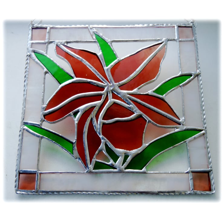This is a stained glass suncatcher made using the Tiffany copper foil technique.