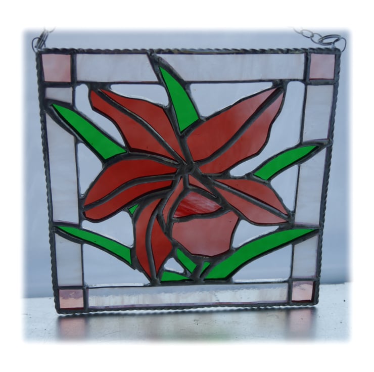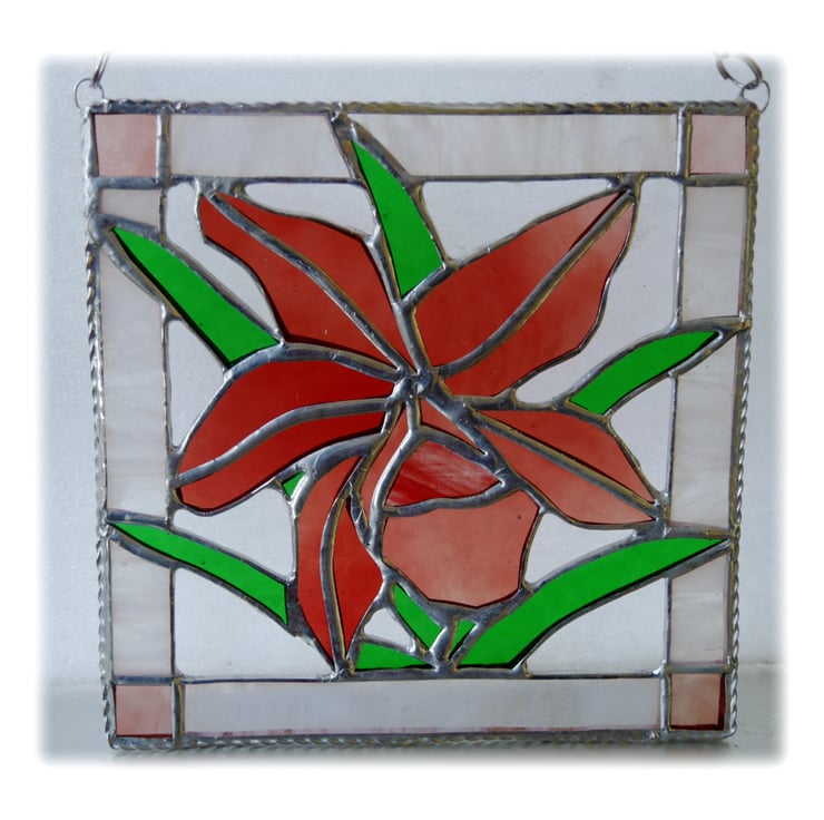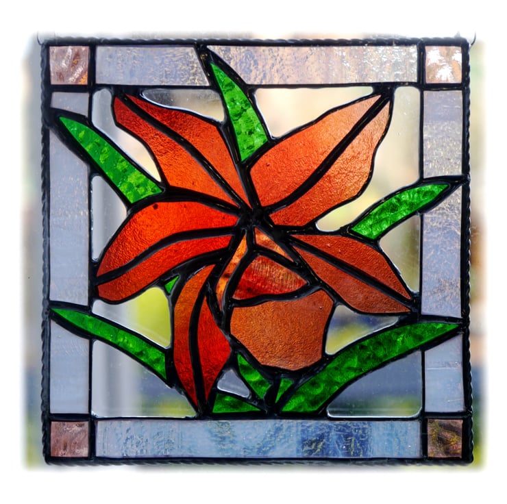 I've cut the orchid from some lovely rose red glass, with slight graduations of shade and a little copper red in the centre for contrast. The leaves are bright green and I've framed with a pretty streaky white with more rose on the corners.