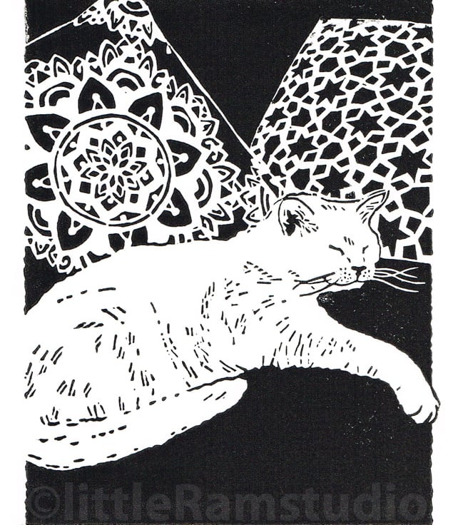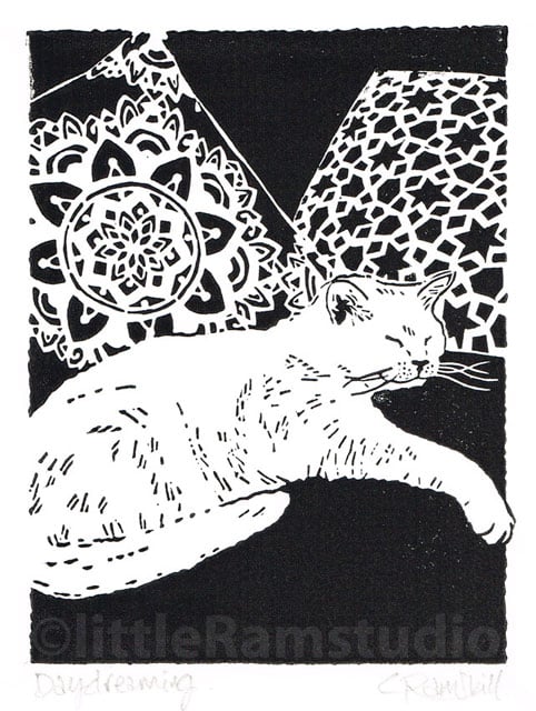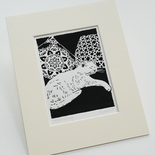 White cat linocut print titled 'Daydreaming' Signed and titled in pencil by the artist.