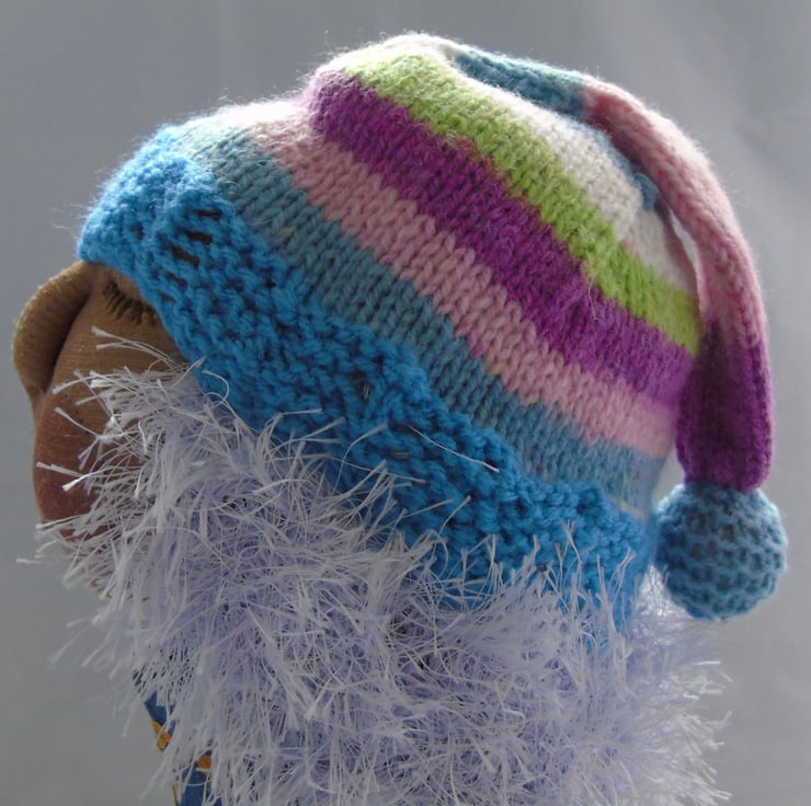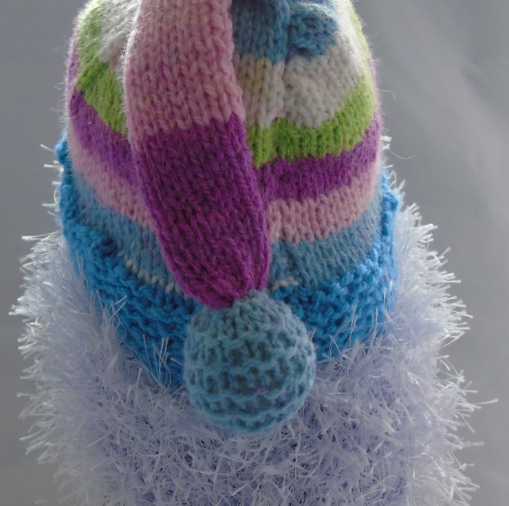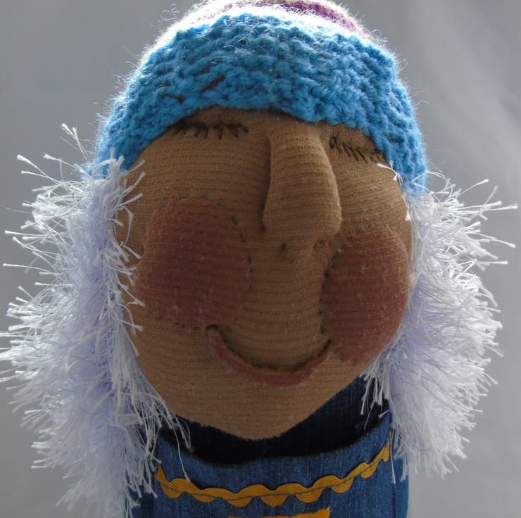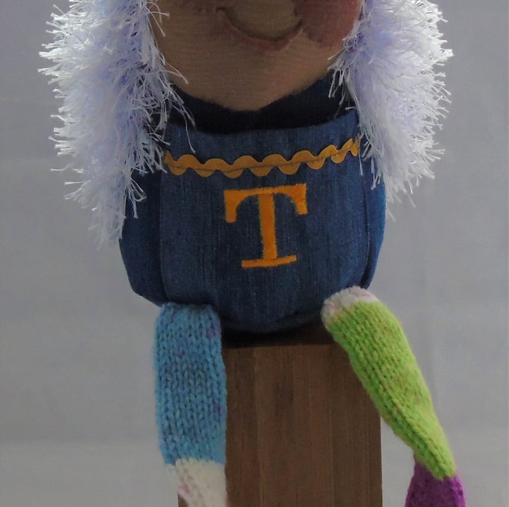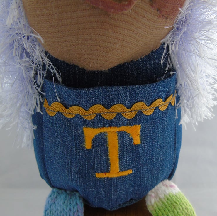 The Brownie has been made from upcycled fabric, including denim and tights and also using scraps of wool to make the hair, legs and hat. The Brownie measures 23 cm tall and is approximately 40 cm in diameter
