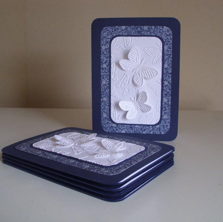 5 x Dark Blue Folded cards, decorated with a blue and white floral pattern paper and