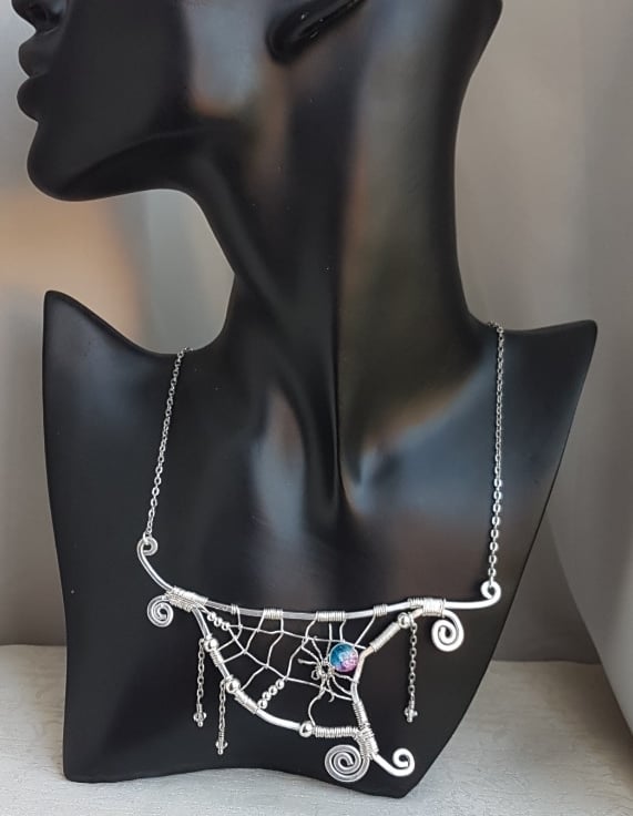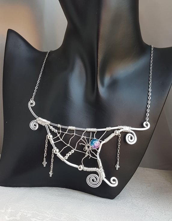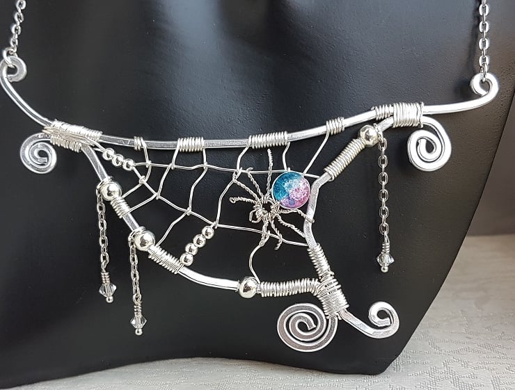 Spook-tacular, and very large, Spider and Web pendant on steel chain. Gorgeous and creepy-cute as a gift, great as a spooky accessory or as part of your Halloween costume. Web is made from Aluminium, silver tone copper wire, Silver plated beads and dangly Silver Shade Swarovski bicone crystals.Fabulous and a very large ornamental piece. The spider is made from Silver tone wire and a bi-colour crackle glass bead.