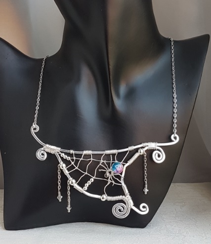 I love animals, anything that is fluttery, furry, scaley and creepy-crawly. I had made a few wire Spiders for Halloween and was going to use them for my costume. In the end i didnt have time to make what i had wanted to with them, so I kept these beautiful little spiders to use in the future. This is the first gorgeous piece I have made using said critters. I love the swirly-ness of it and its creepy-cute nature. Its a great statement piece as a spooky accessory or as part of your Halloween attire.