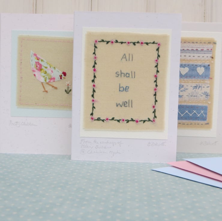 The titles of the cards are: Pretty Chicken, All Shall Be Well, and Blue and White.