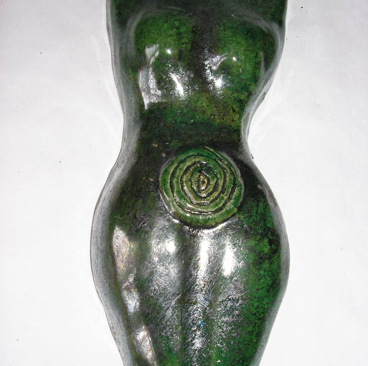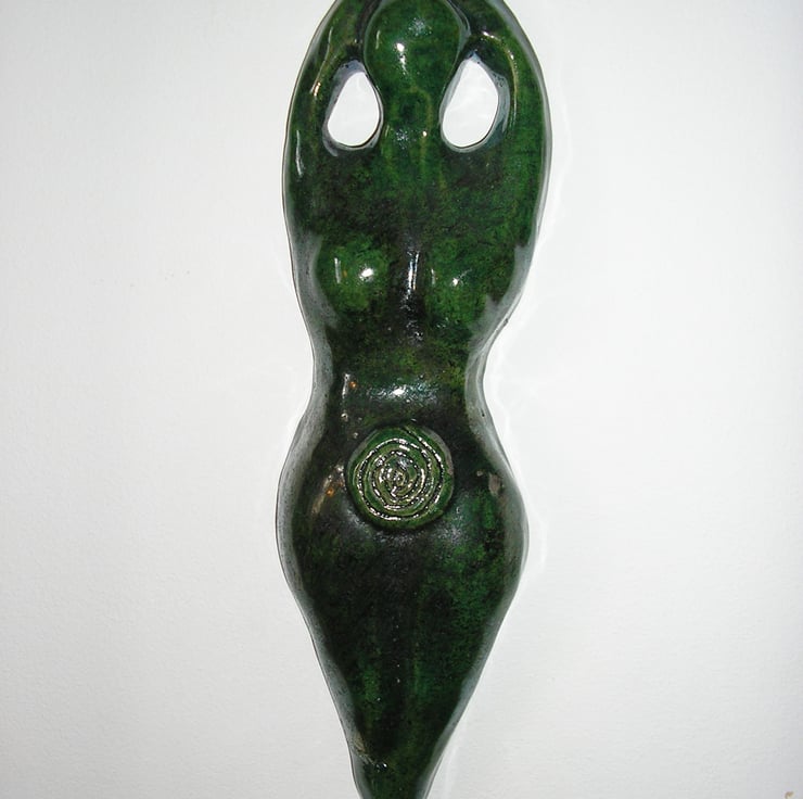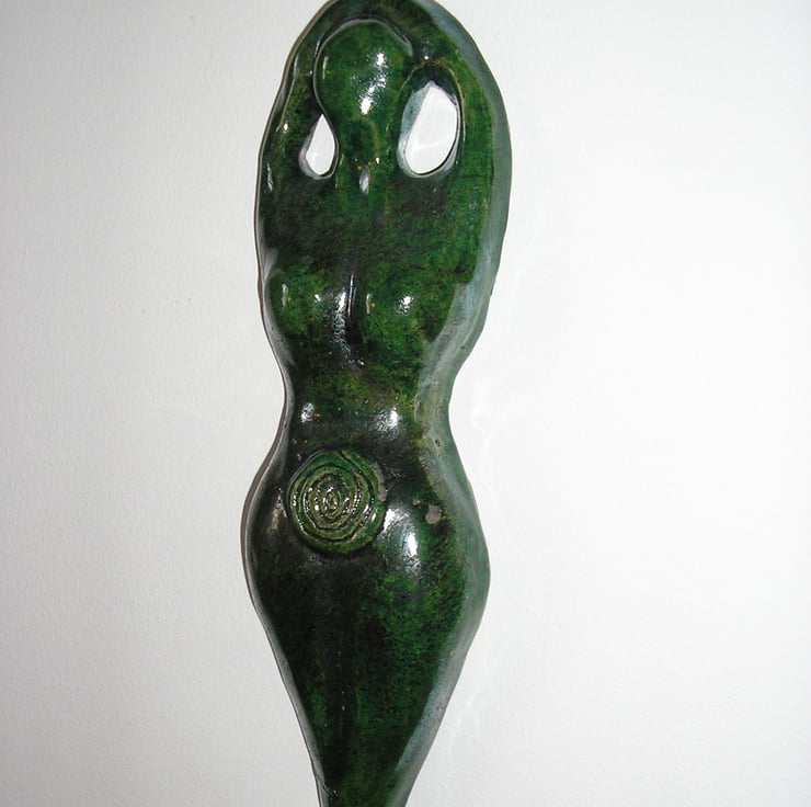 I have been making goddesses for many years and sculpted this goddess, then used a raku glazed finish.