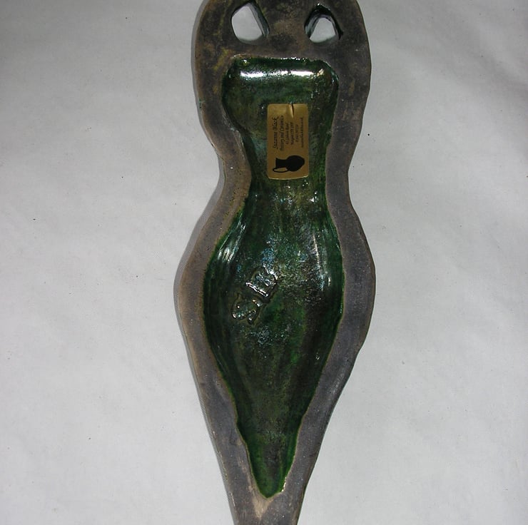 A BEAUTIFUL GODDESS WALL HANGING 29 CMS LONG. EARTHENWARE, GLAZED WITH A GREEN RAKU GLAZE. THERE IS A HOLE IN THE BACK TO ALLOW THE GODDESS TO BE SECURED TO A WALL USING A STRAIGHT PIN OR SMALL NAIL