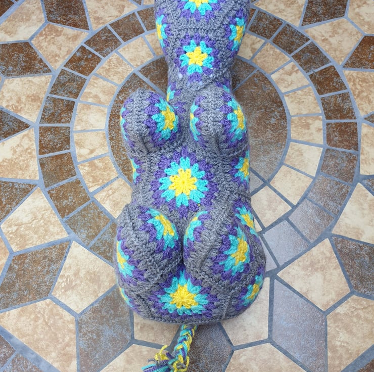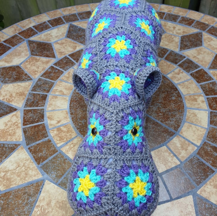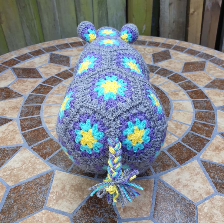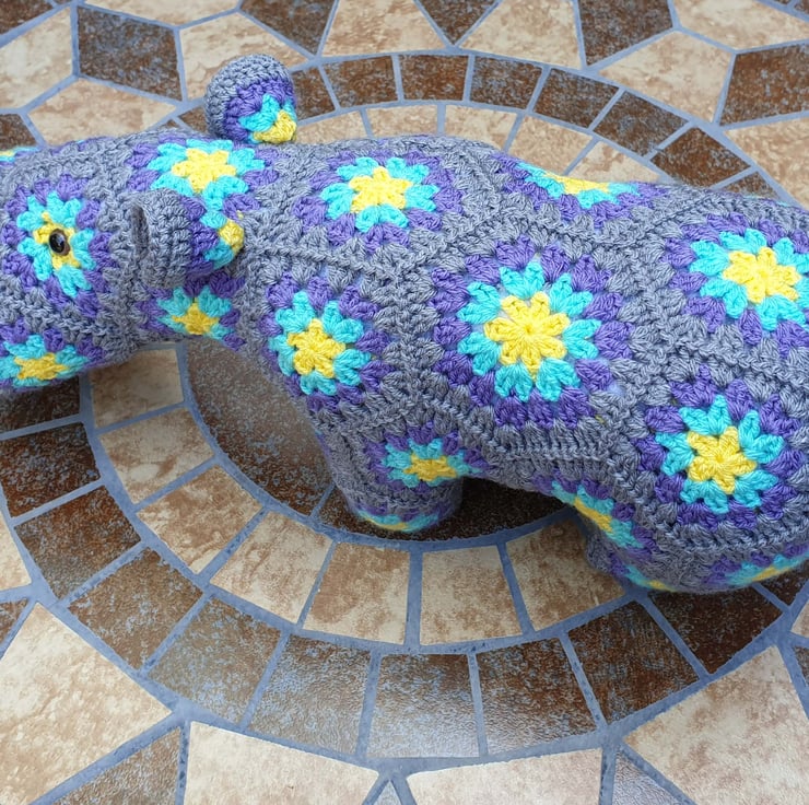 Lovely large stuffed hippo toy, crocheted from granny square motifs. Made from a supersoft acrylic yarn and stuffed with polyester filling and fitted with brown safety eyes.