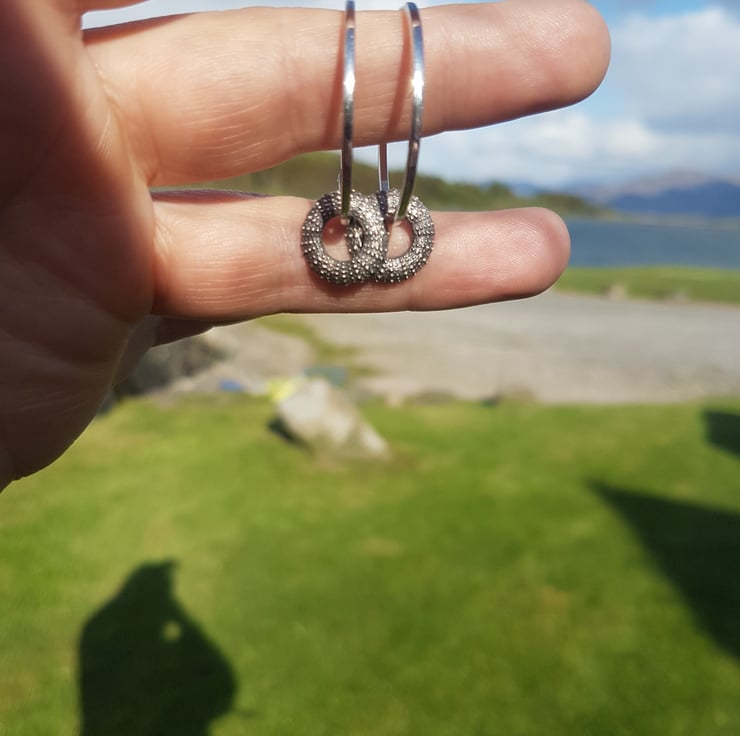 They hang from the large 35mm sterling silver hinged hoops on the pictures, that have a lovely square profile. Larger or smaller cheaper hoops are available on request, just contact us.