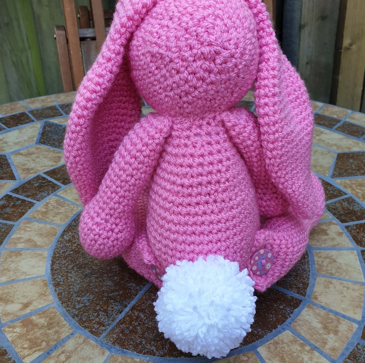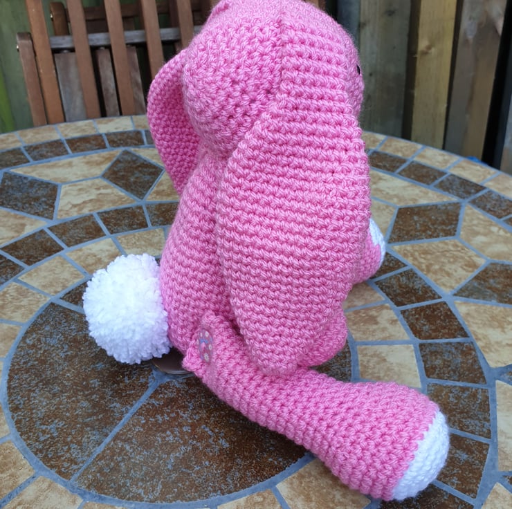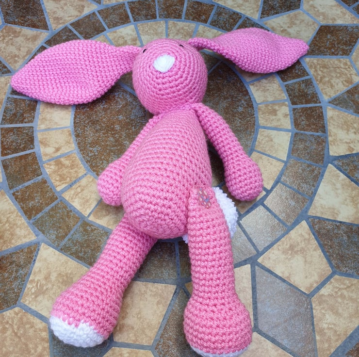 Lovingly handmade crochet bunny rabbit soft toy with move-able legs. Super cute and cuddly with big floppy ears.