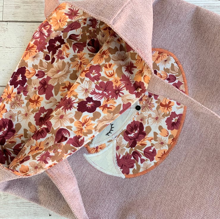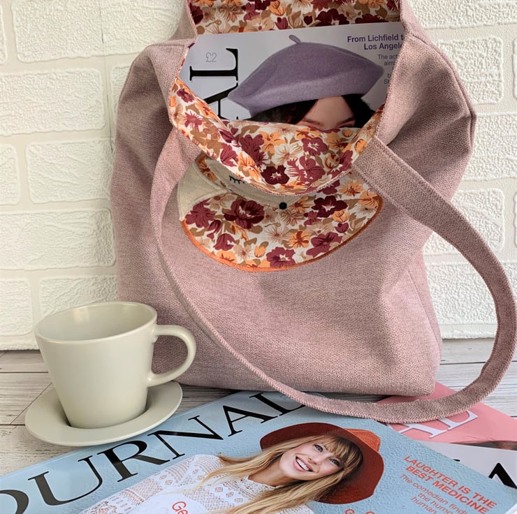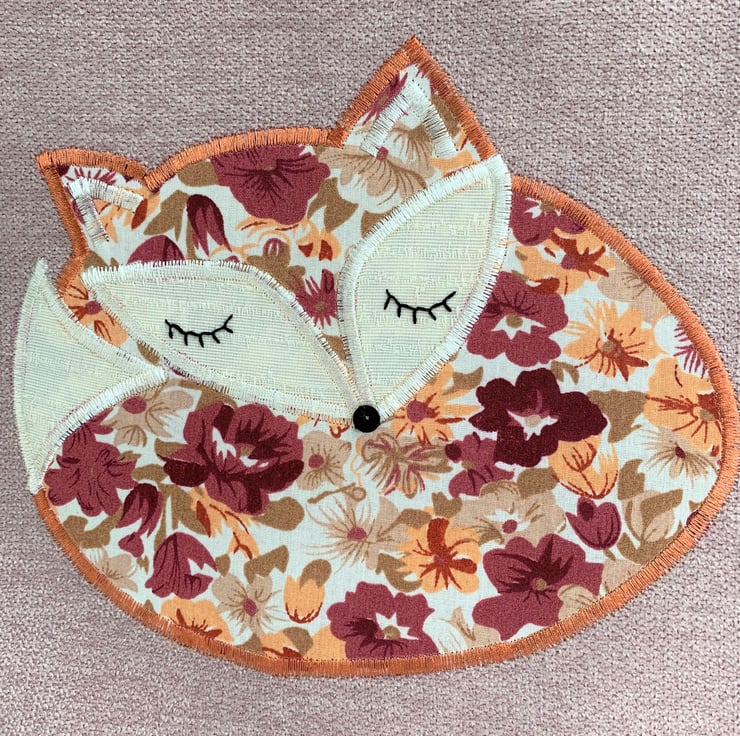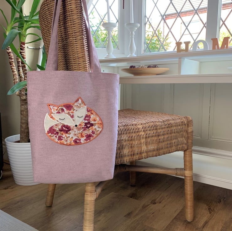 A cute fox tote bag in dusky pinky lilac coloured fabric with an appliqué sleeping fox. The main body of the fox is made from floral print fabric in shades of peach, maroon and beige on a white background. The face markings and tail tip are made from cream fabric with woven streaks with a slight sheen. I've hand-embroidered the closed eyes in black embroidery thread, and added a black sequin nose. The bag is fully lined with floral print fabric which matches the main body of the fox.