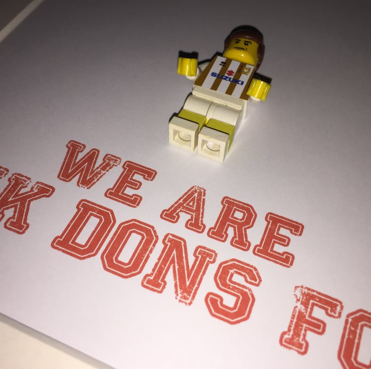 Our collection of tributes to sports teams around the world is growing steadily and our latest offering comes in the form of a little mini MK Dons footballer. This minifigure has been put together with a custom sticker for the front of his torso. He is wearing the latest kit, mounted in to a deep box frame and comes with the printed words "We are MK Dons FC" underneath.
