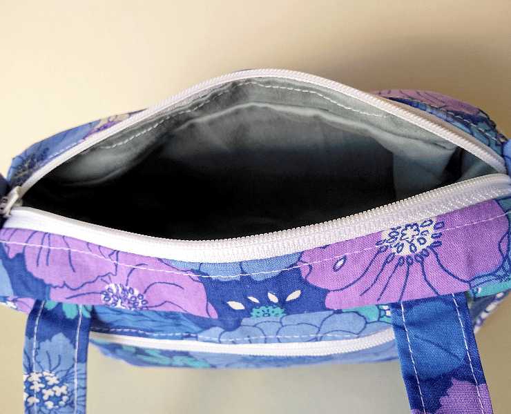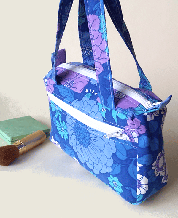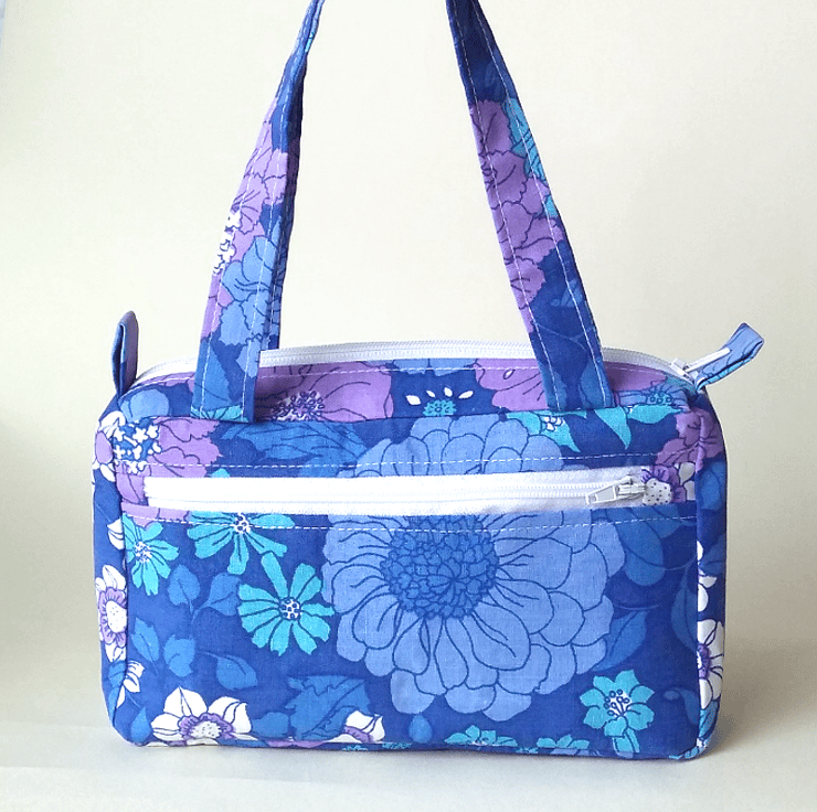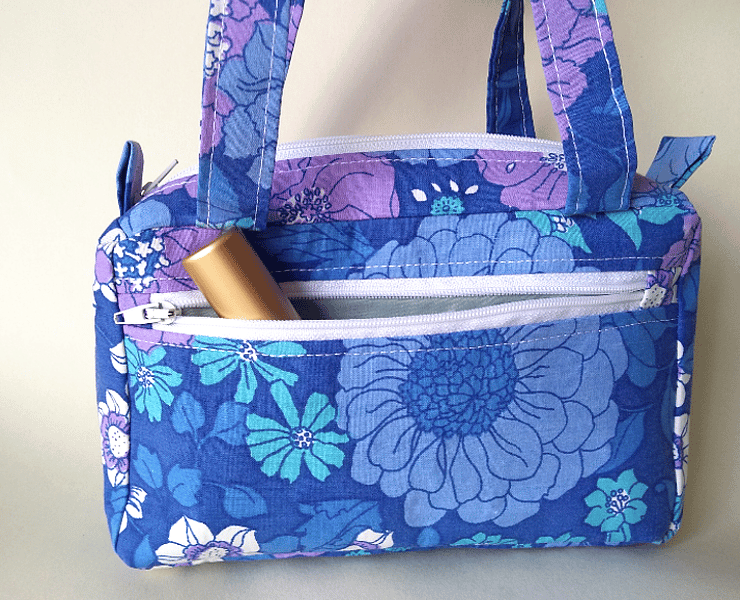 This is a cute, boxy handbag made out of a vibrant retro-style, floral fabric, with gorgeous shades of lilac and blue (royal blue, teal blue, pale blue, turquoise) and splashes of white. Though the bag is small, its boxy shape makes it roomy enough to carry your essentials. It can also be used as an organiser inside a larger bag.