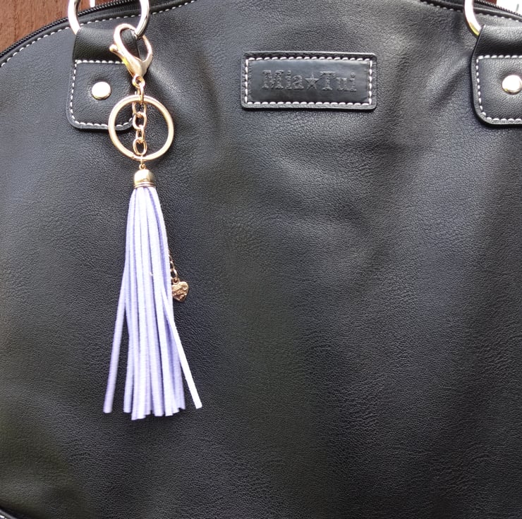 Handcrafted tassle which has been made using lilac coloured faux suede.