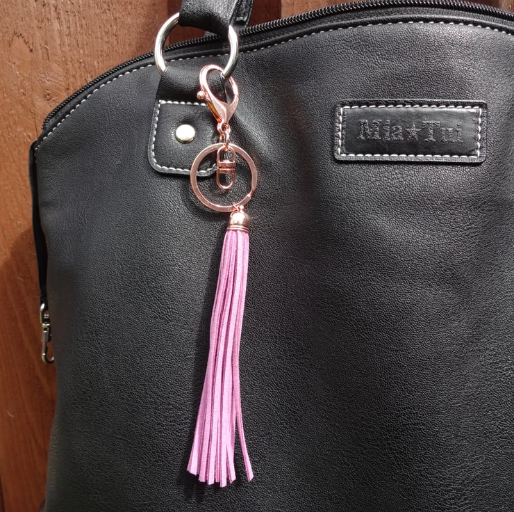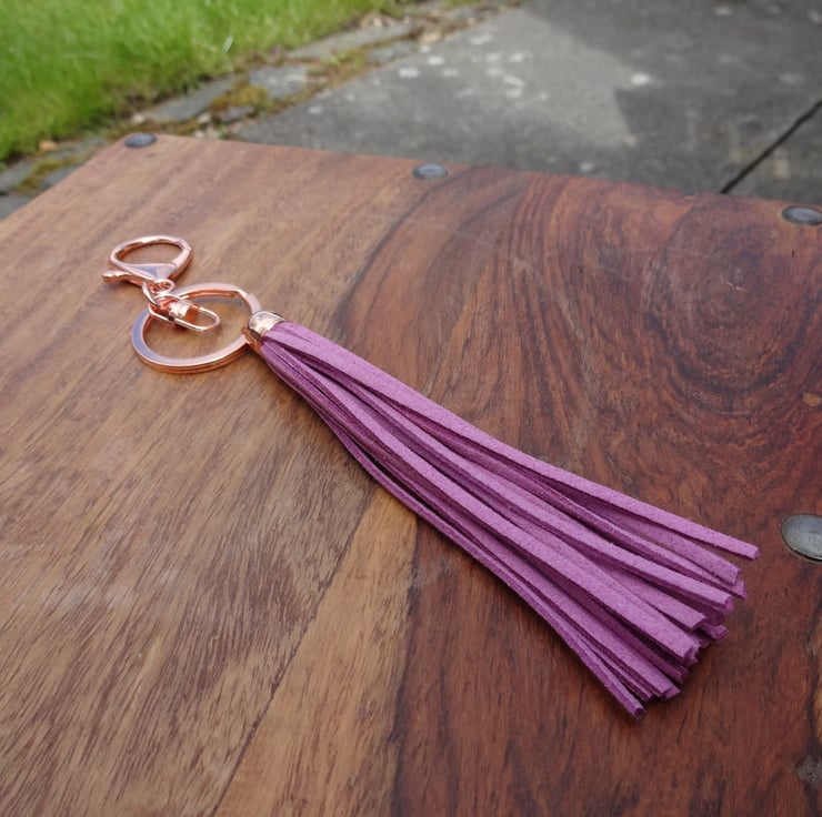Handcrafted tassle which has been made using an orchid coloured faux suede.