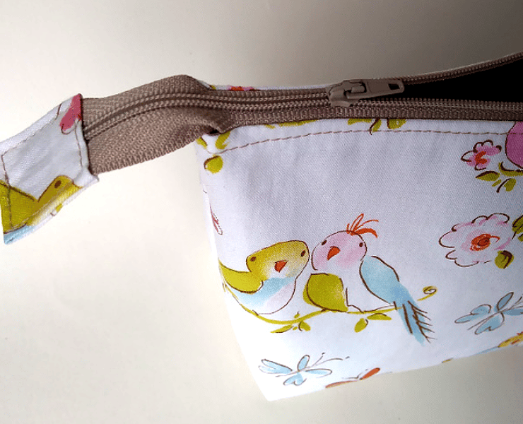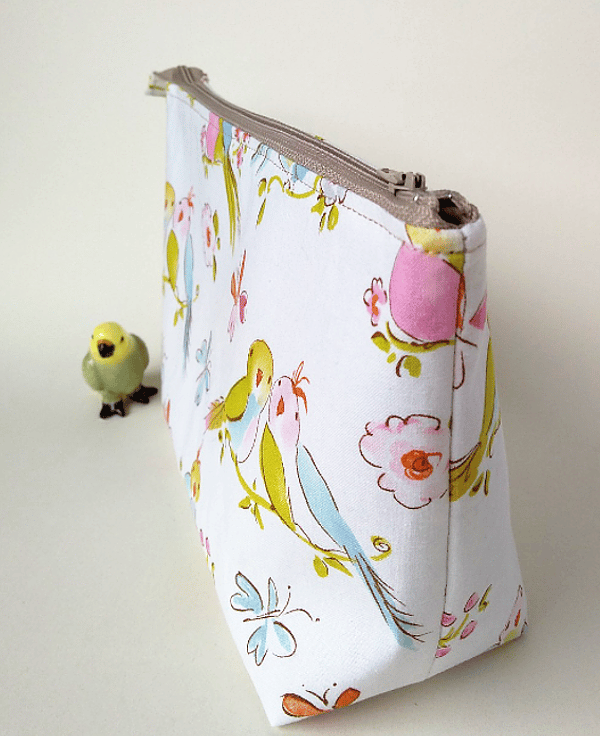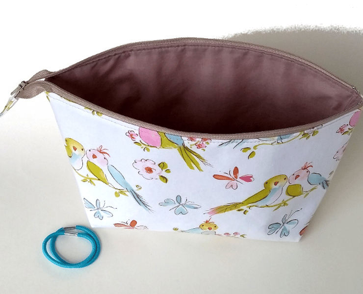 This is a pretty zipped pouch, made with a cotton fabric. This lovely material has birds, butterflies and flowers. This would be an appropriate gift for a bird lover!