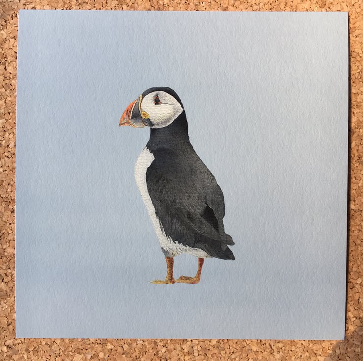 A 200 mm x 200 mm (approx) fine art giclée print of a detailed watercolour and coloured pencil painting of a puffin, placed on a soft blue-green background.
