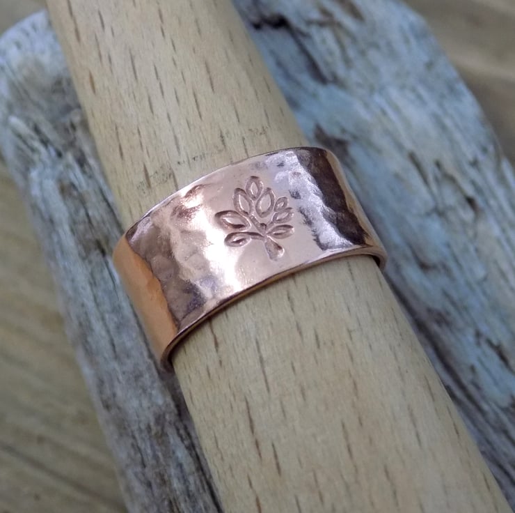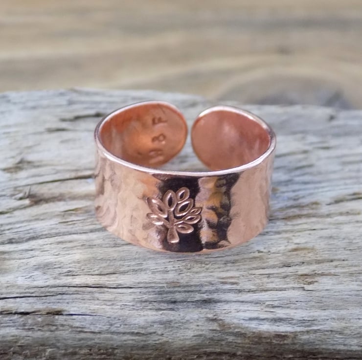 Made from 0.9mm thick copper sheet. The finish on the 1 cm wide band has a dappled effect and a lovely tree design stamped in the middle. It has been filed, sanded , shaped and polished for a comfortable fit. This particular size is set at it's smallest , approx. a size UK N but will adjust a few quarter sizes larger.