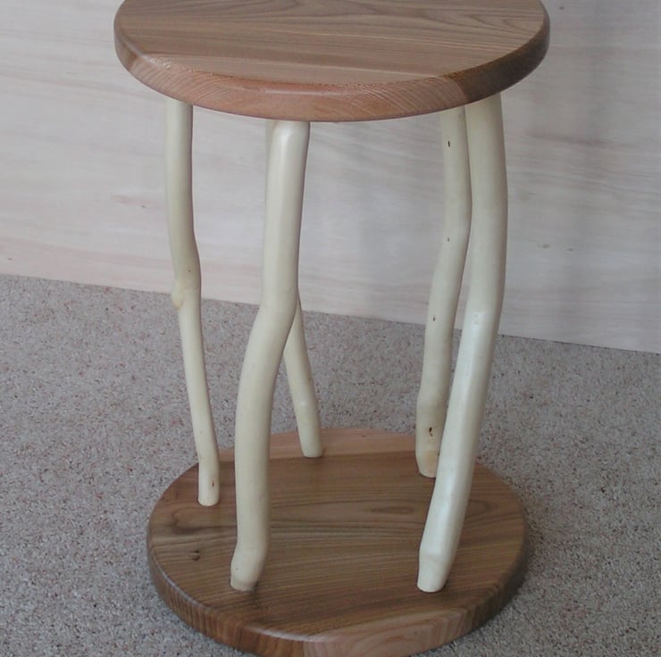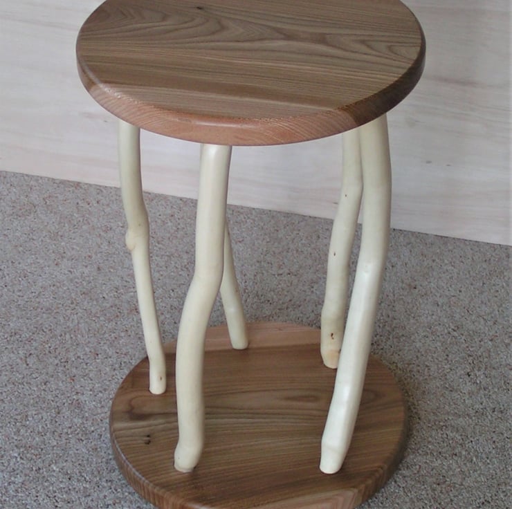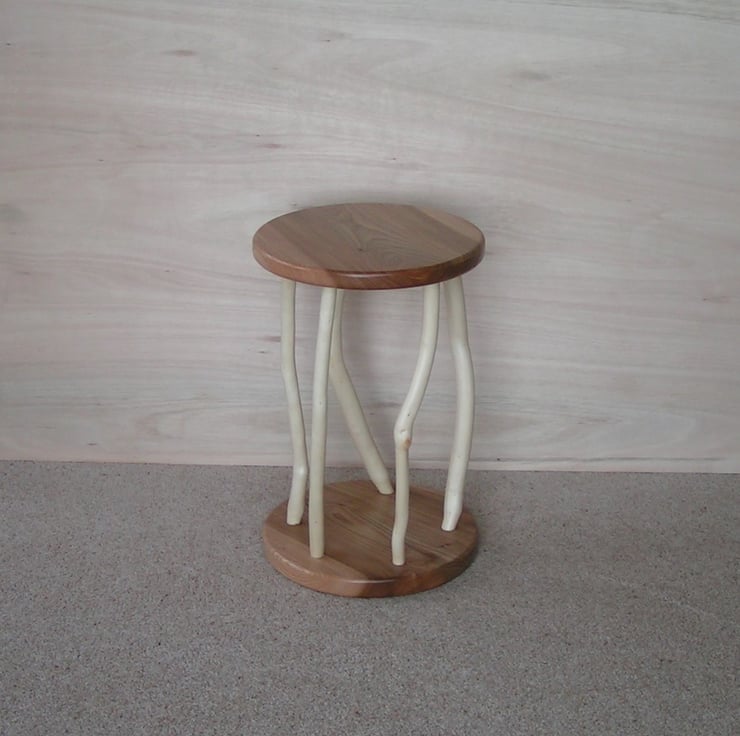 Made from local wind-blown wych elm with rhododendron legs that make this table truly one of a kind. Perfect for keeping that cup of tea within easy reach of your favourite armchair. Height 37.5cm. Diameter 27.5cm.