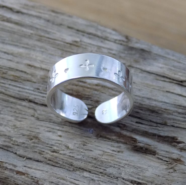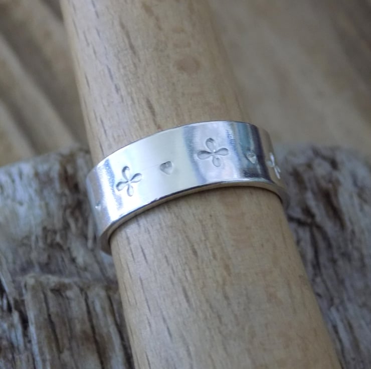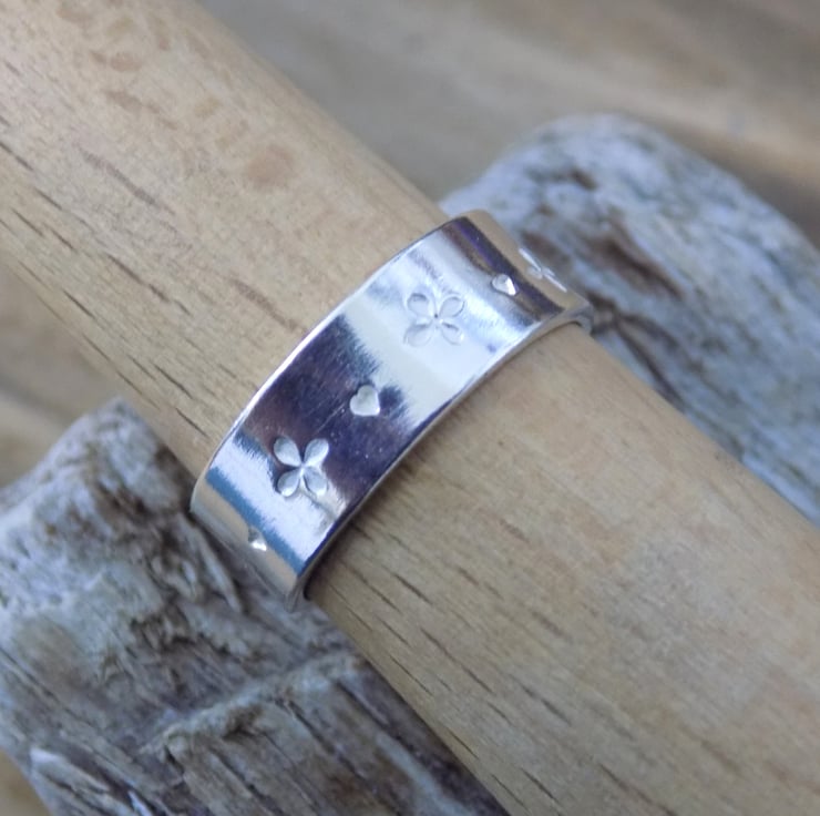 Made from 1mm thick sterling silver sheet. The ring has a Quatre pattern stamped all around the 6mm wide band interspersed with the prettiest daintiest hearts. It has been filed, sanded ,shaped and polished for a comfortable fit. This particular ring is set at it's smallest size a UK I , ideal for the smallest finger or a child. Can be gently opened a few quarter sizes larger.