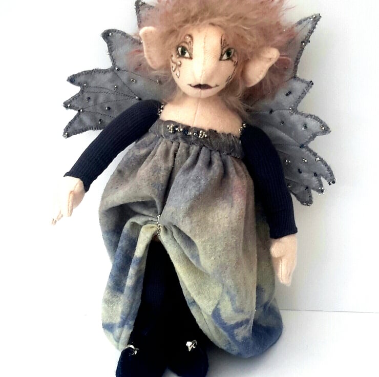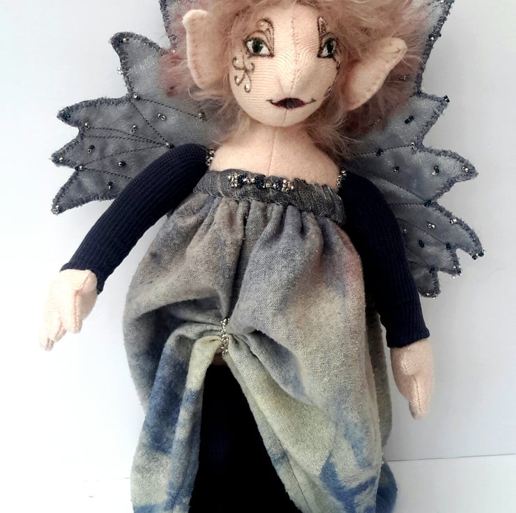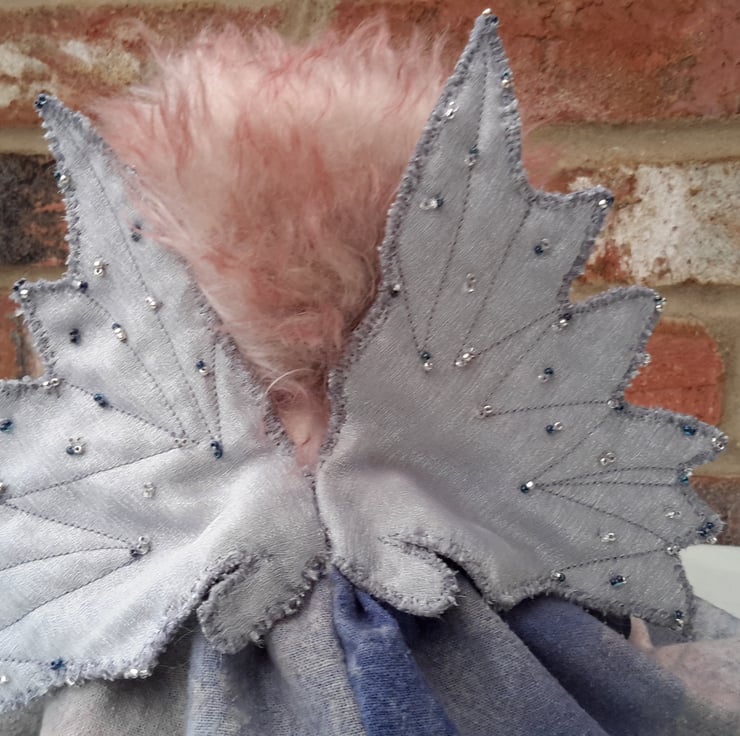 Her wings have been triple hand sewn and are made from grey satin fabric with crystal organza overlay and hand decorated with beads, the veins were machine sewn.