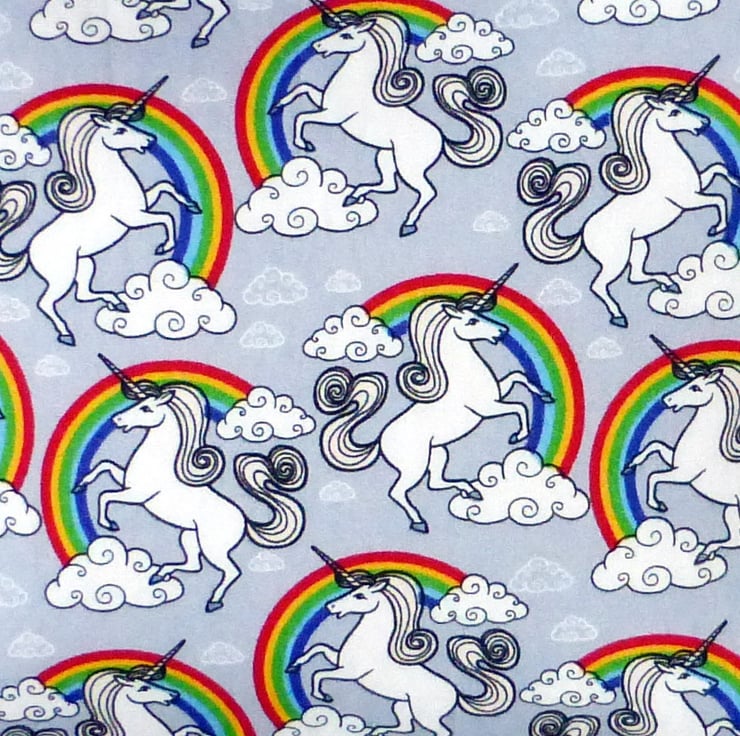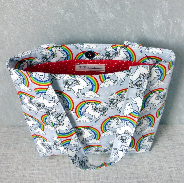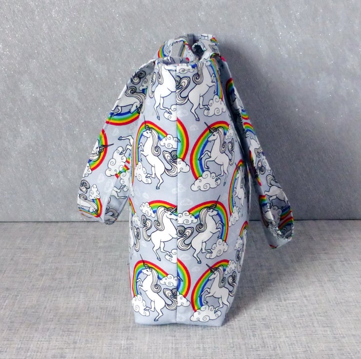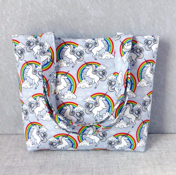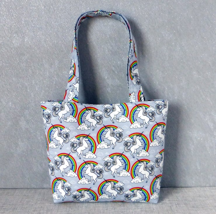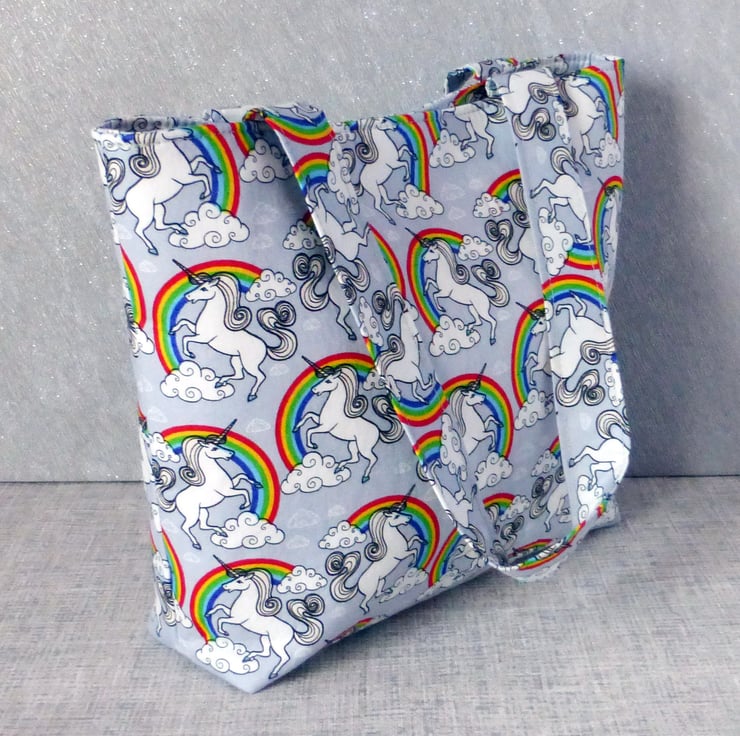 A lovely mini tote bag which would be great for a child, or an adult that just wants a small bag, made of 100% cotton fabric with a unicorns and rainbows design on a light grey background.