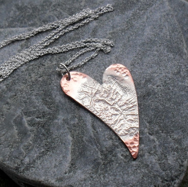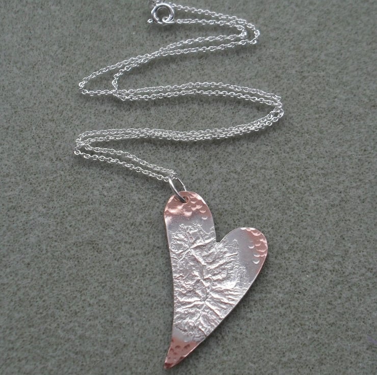 Copper heart pendant which has been cut from a sheet of copper then the pendant has been ,sanded, hammered to give texture,and sterling silver has been melted on the top