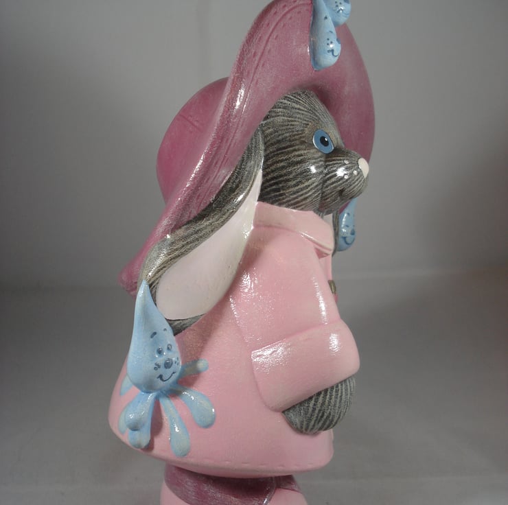 I have for sale a ceramic animal figurine ornament, which was hand painted by myself. It is a girl bunny rabbit standing figurine, wearing a pink coloured hat, raincoat and shoes. There are some cute looking raindrops on the hat and coat. This would make a lovely addition to anyone's home, or perhaps given as a gift.