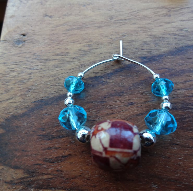 Made using various sized metal beads, acrylic bevelled beads and a wooden bead.