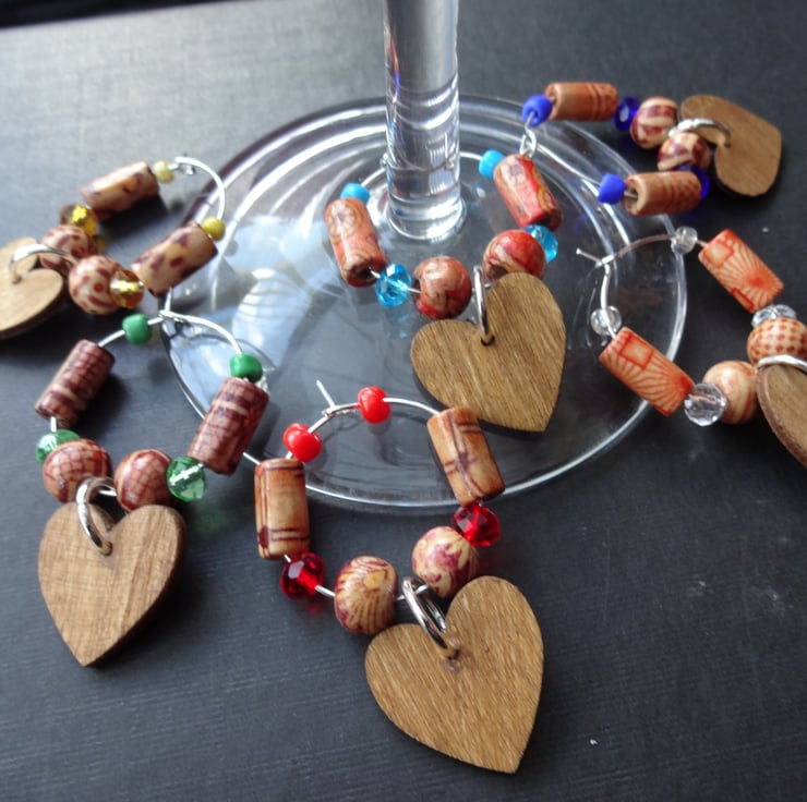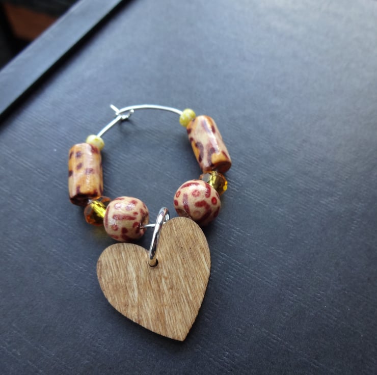Handcrafted using acrylic bevelled beads, large seed beads, wooden beads and a wooden heart.