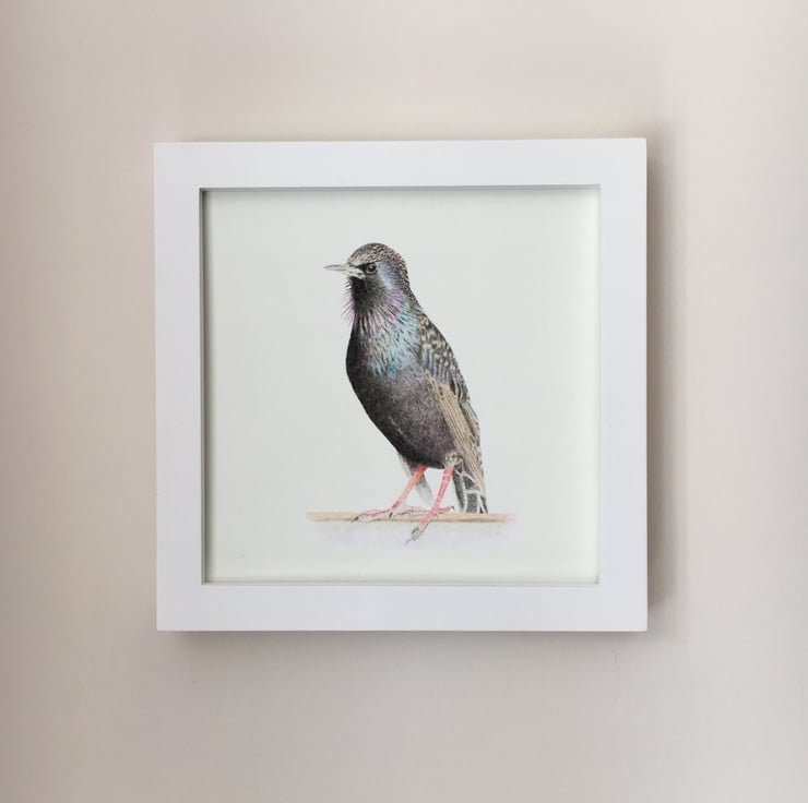 A 200 mm x 200 mm (approx) fine art giclée print of a detailed coloured pencil drawing of a colourful starling in the sunshine. (Please note the frame is not included.)