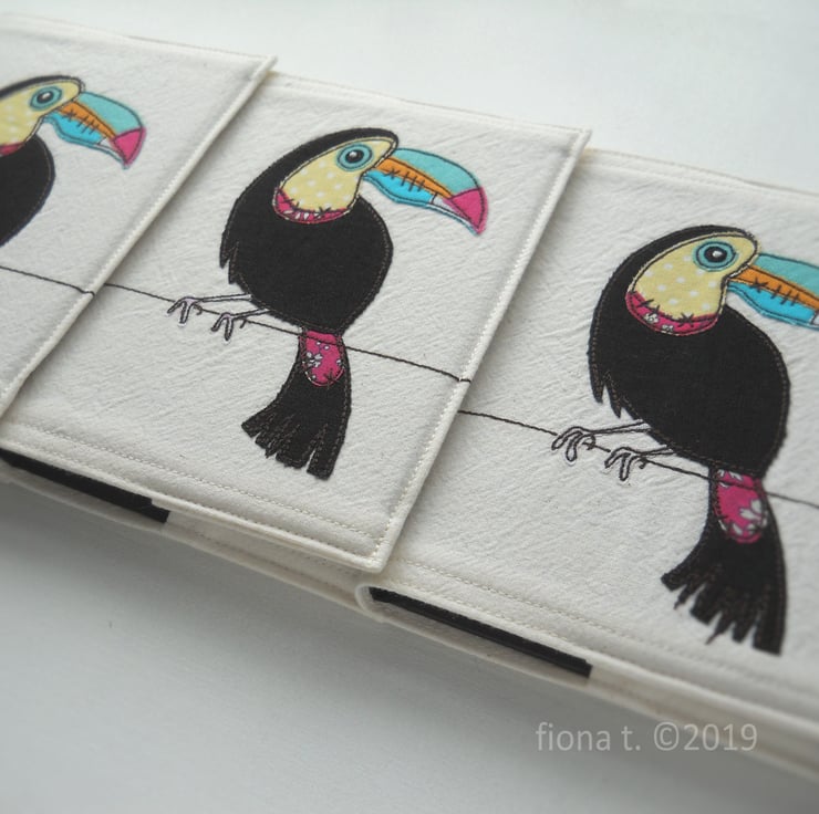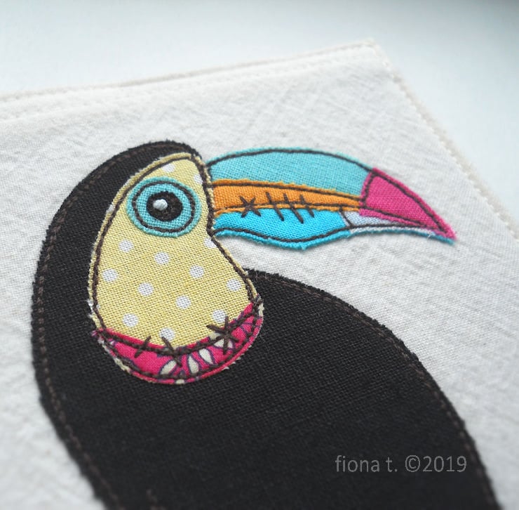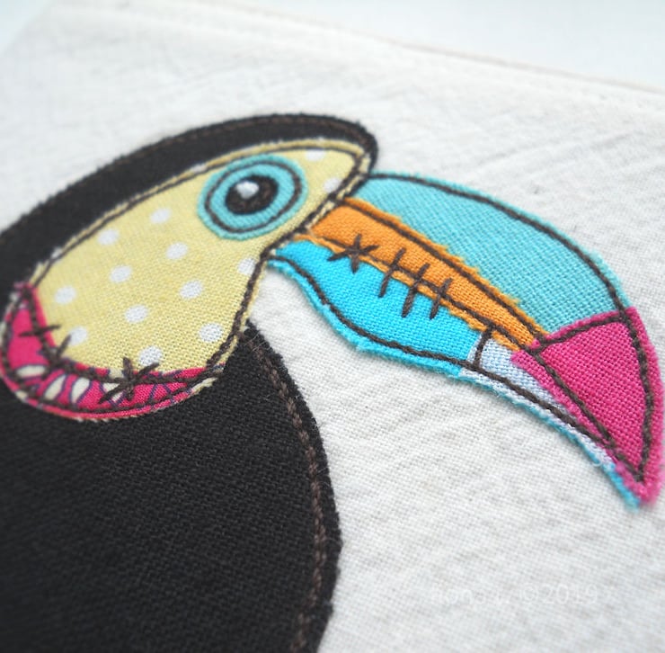 this embroidered cover features a rather dapper zombie toucan in bright pink, yellow, turquoise, green & blue cotton fabrics.