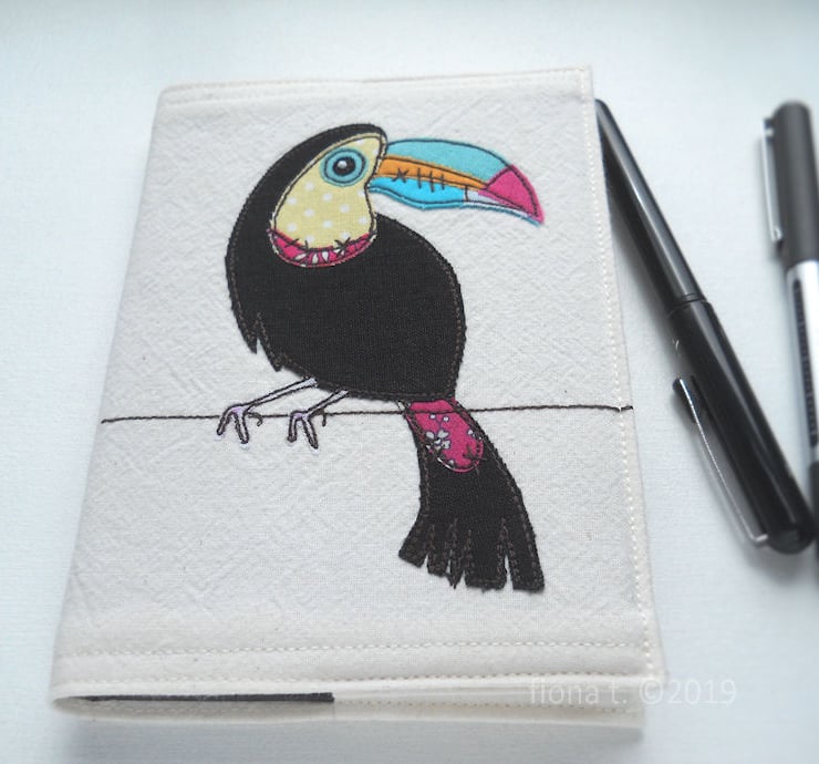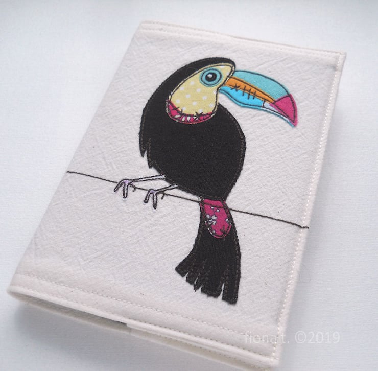 applique & freehand embroidered zombie toucan notebook cover with A6 sketchbook inside.
