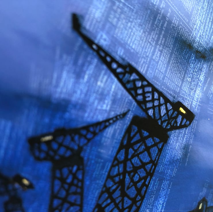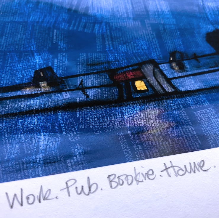 The warm lights from each window work as a beacon to his next destination. Genuine horse-racing sections from newspapers work as a collage to re-create the rain, mist and steam.
