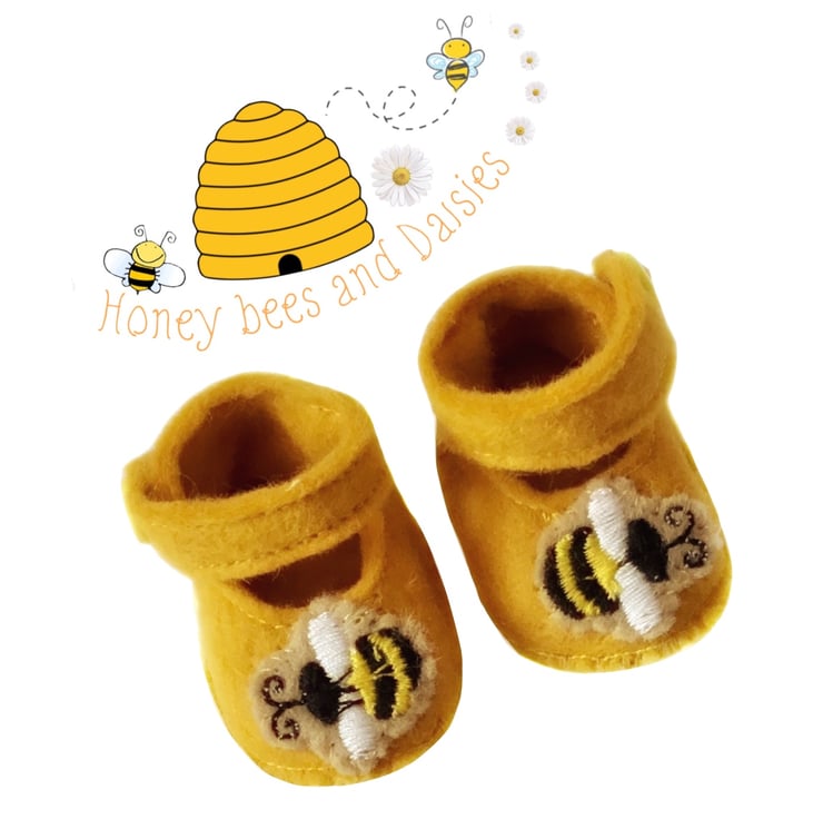 Just the most adorable little handcrafted pair of mustard felt shoes, to fit the Mulberry Green characters. The shoes are made from best quality wool felt and are embroidered with little bumble bees. They fasten with a popper underneath a little yellow button.