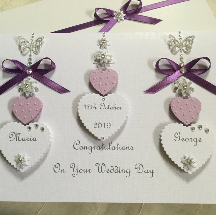 This card is personalised with the names of the couple in the hearts, the date of the special occasion along with the greeting of your choice at the bottom of the front of the card. Please contact me with your personalisation requirements when you place your order.