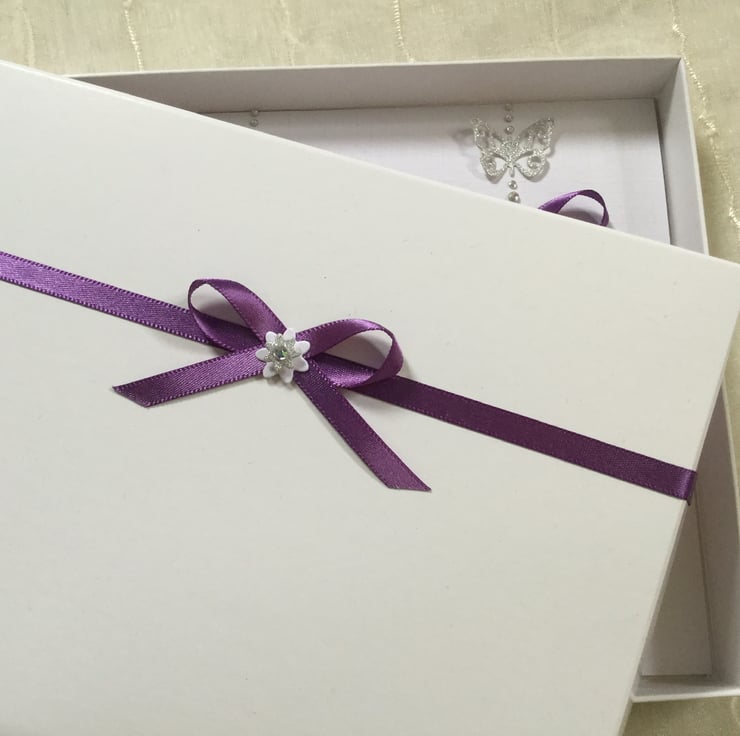 This handmade card is A5 in size (210mm x 150mm) on 300gsm heavyweight linen cardstock and can be for a wedding, engagement, anniversary or any other special occasion for a couple. This lilac and purple hearts card is decorated with ribbons and gems. I make each card to order and they can be personalised inside as well as on the front of the card.