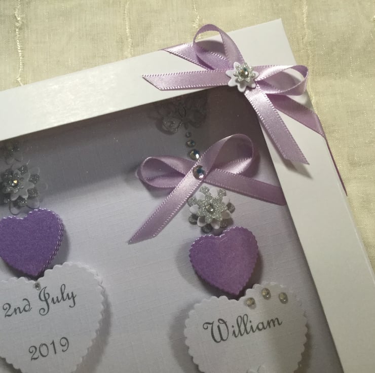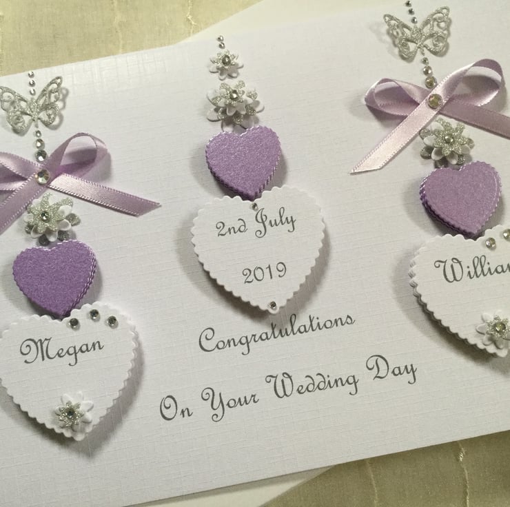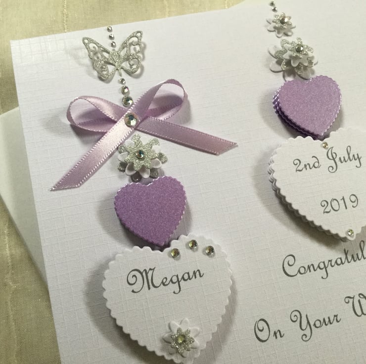 This handmade card is A5 in size (210mm x 150mm) on 300gsm heavyweight linen cardstock and can be for a wedding, engagement, anniversary or any other special occasion for a couple. This lilac and silver hearts card is decorated with ribbons and gems. I make each card to order and they can be personalised inside as well as on the front of the card.