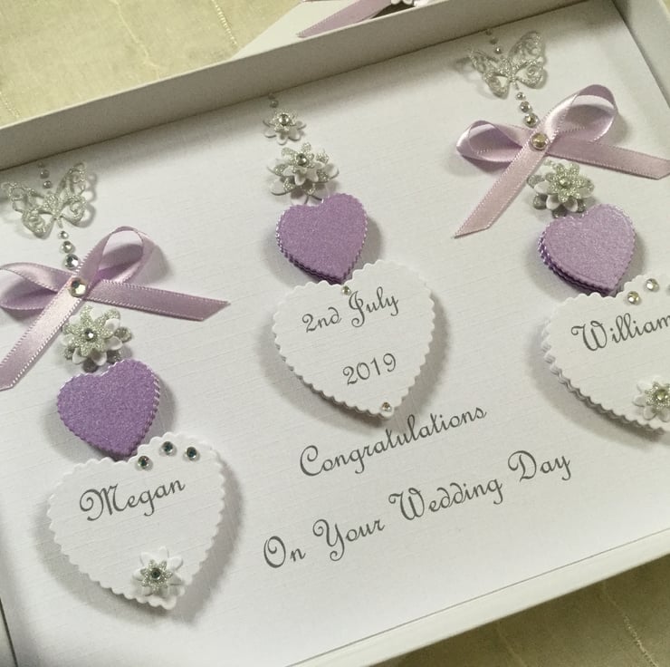 This card is personalised with the names of the couple in the hearts, the date of the special occasion along with the greeting of your choice at the bottom of the front of the card. Please contact me with your personalisation requirements when you place your order.
