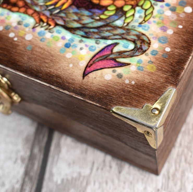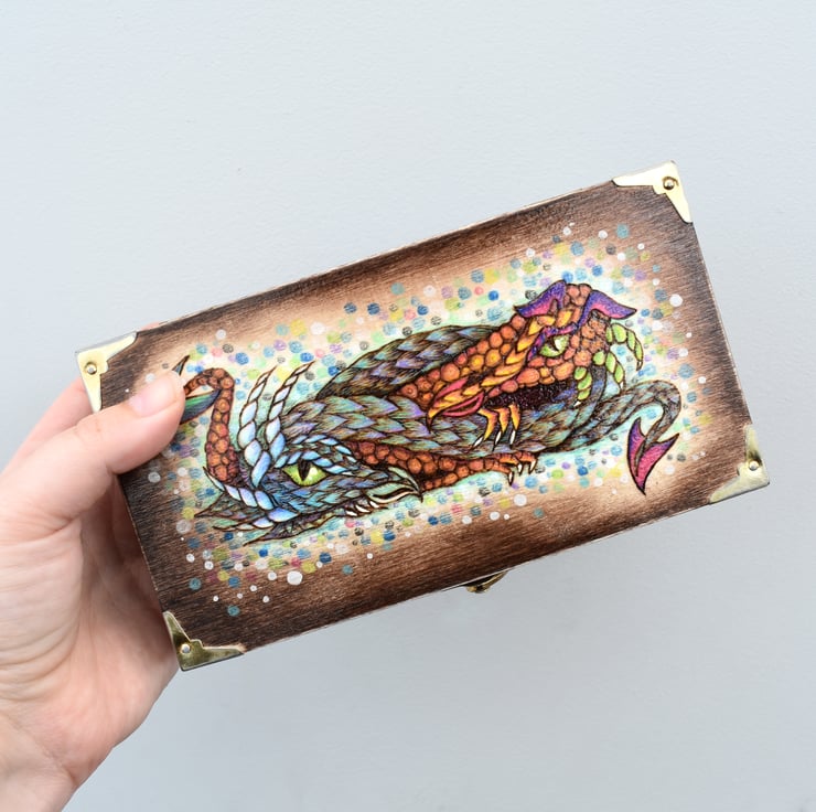 A rustic small rectangular box, with a dragon couple coiled in an embrace. The design has been burned into the box using pyrography. I then stain and sand the box to give some character. The dragons are then coloured with prismacolor pencil. UV protector is applied to the design, and the whole piece is protected with a clear lacquer. This is by no means a perfect box. I tend to rescue unloved pieces and upcycle them.