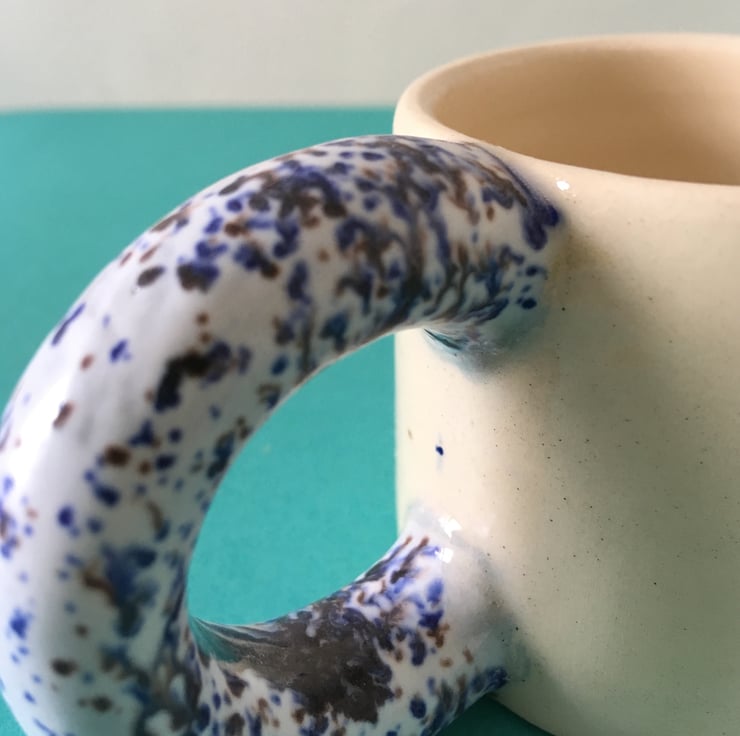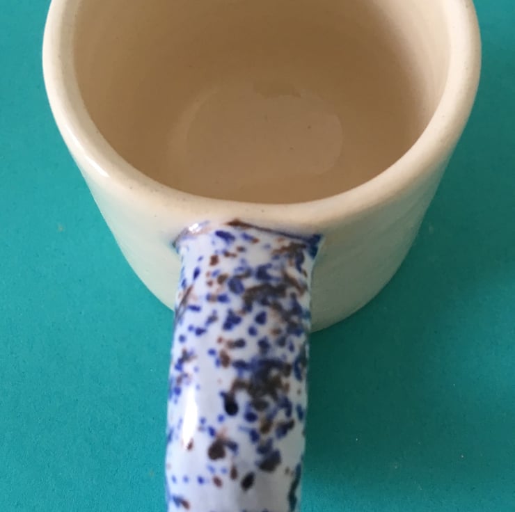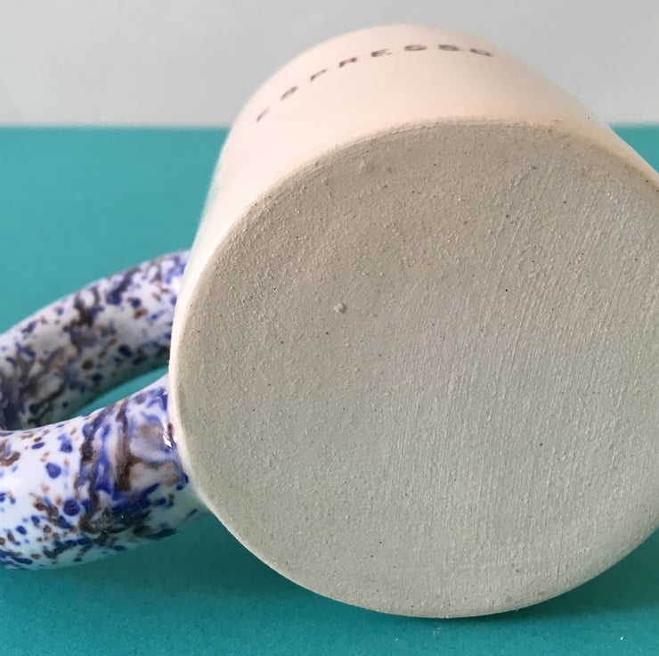 A very cute little cup. This little fella has a creamy white earthenware body. A simple “Espresso” decal fired to a warm brown colour and a simple but speckled blue and white donut handle.