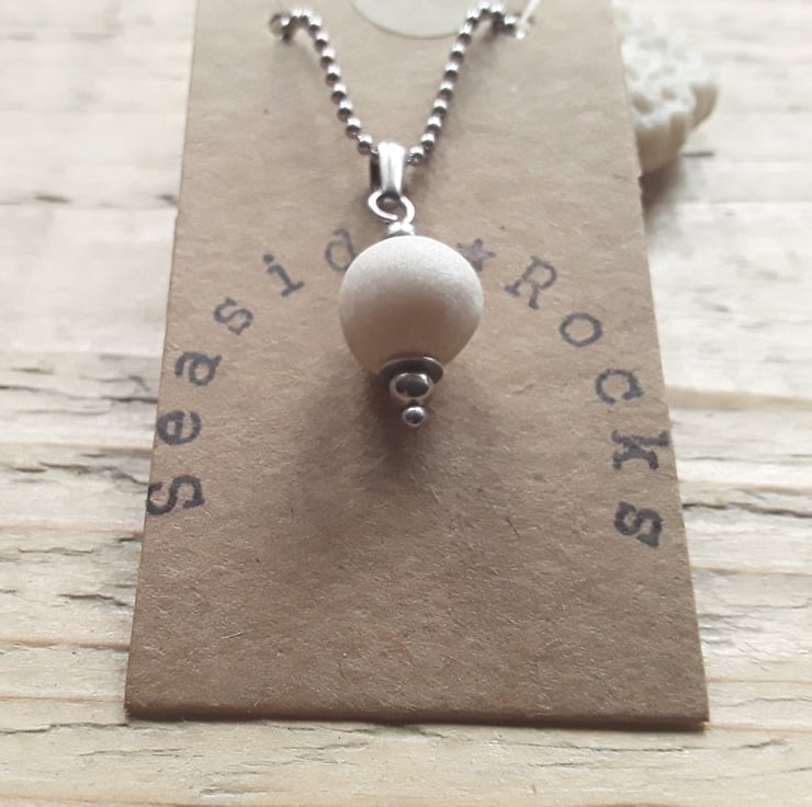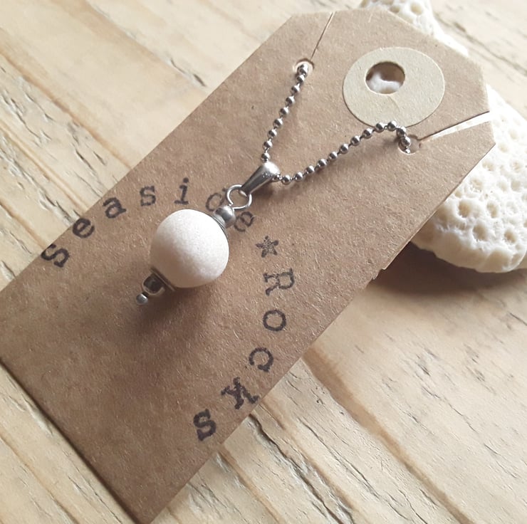 An almost perfectly, and naturally, formed milky-white sphere beach pebble with stainless steel additions, hanging from a stainless steel 17 inch ball link chain.