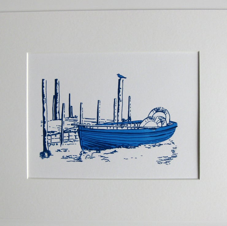 Hand screen printed design with hand mixed colours in coastal blues. Printed on 300g acid free cartridge paper with old english white colour mount, ready for framing.