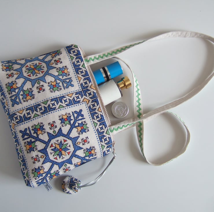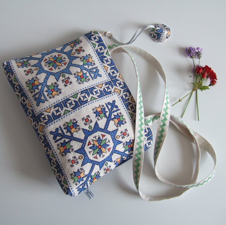 I was given this fabulous old vintage tablecloth by a friend in York. I made it up into a practical and rather wonderful handbag, which can also be used as a shoulder bag.